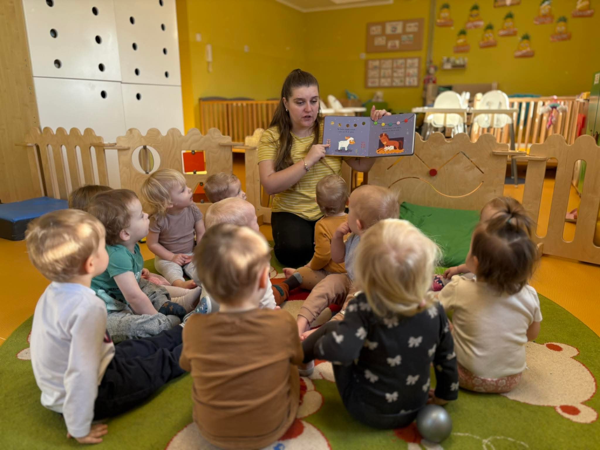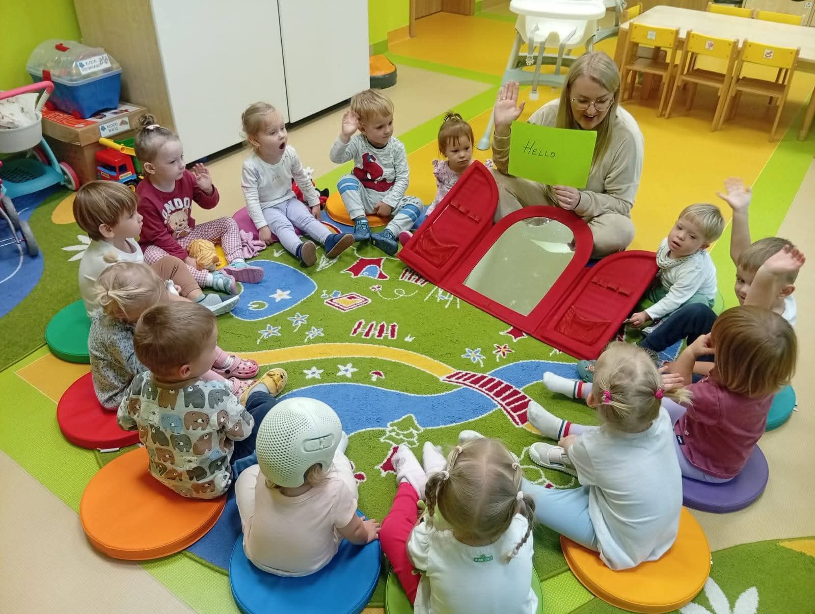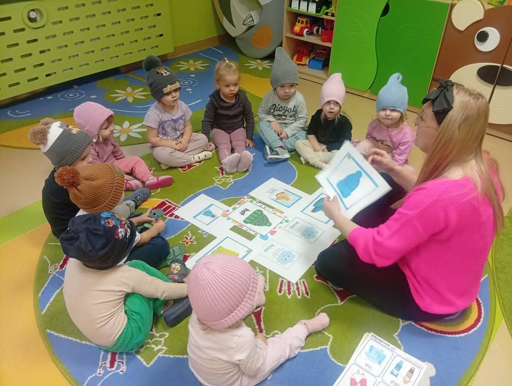 Dzieci nie muszą mówić – słuchają, pokazują, kojarzą. Tematami są proste słowa z życia codziennego ( zwierzęta, kolory, zabawki itp.).
